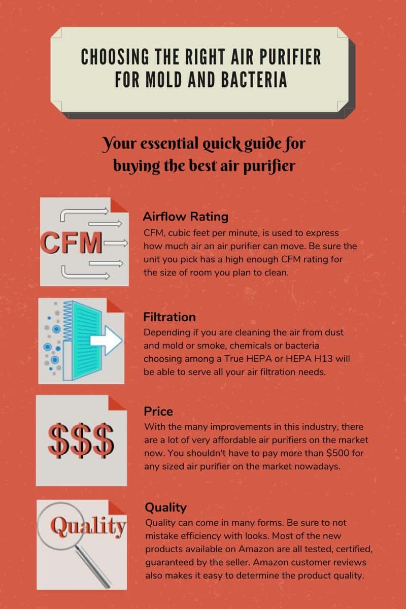 What Is The Best Air Purifier For Mold & Mildew? [5 Picks] 3-IN-1 AIR PURIFIER FOR HOME - True HEPA air filter reduces up to 99.97% of harmful germs, dust, pollen, pet dander, mold spores, and other allergens as small as .3 microns from the air KILLS GERMS - UV-C light helps kill airborne viruses such as influenza, staph, rhinovirus, and works with Titanium Dioxide to reduce volatile organic compounds Best air purifier for mold and mildew - Tellan Insights So here is our list of air purifiers for mold. 1. The Gocheer (GH-Monster) Smart Air Purifier Well, the Gocheer GH Monster Smart Air Purifier is indeed a monster when it comes to capturing pollutants. This air purifier can clean up to 4410 square feet in just one hour, 2500 square feet in just 30 minutes, and 1102 square feet in just 15 minutes.